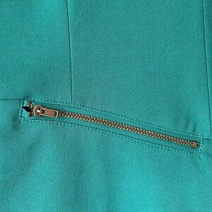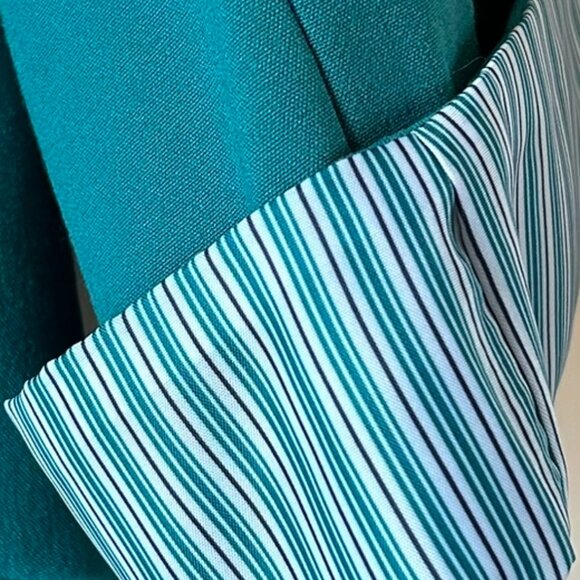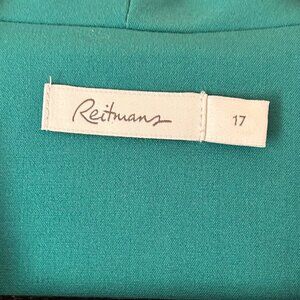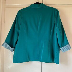 A Reitman's green three-quarter sleeve blazer with one button and two side zippered pockets. The shell material of the blazer is 63% polyester, 33% rayon and 4% spandex. The blazer has a striped 100% polyester lining. Size 17. Dry clean only. Condition is like new.