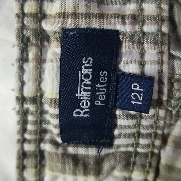 Reitman's Petite khaki green and white plaid shorts with zipper and tie front.