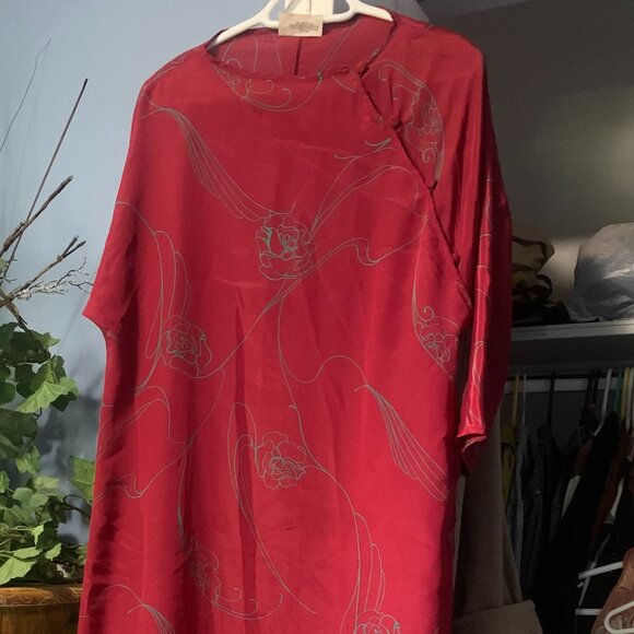 Comfortable, Stylish Night gown wear for the evening of visiting with friends/ southern vacation. Has waist tie if you desire a different look.. 4 buttons on the front - left. Bust from arm pit to arm pit - front and back together is 42 inches The length is 56 inches, the cloth belt came in handy for me, of course it can be hemmed. Turquoise design runs thru the maroon lounging gown.