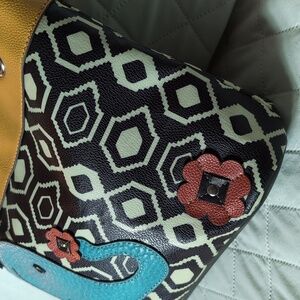 Relic faux leather satchel and wallet with elephant/floral applique design.