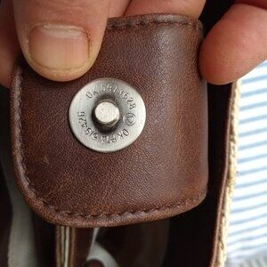 Adorable small purse in dark brown leather and beige basket weave. Measures 8.5 inches wide by 6 inches tall. Has sturdy leather handles. Leather could use some oil, but otherwise in good condition.
