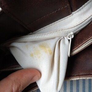 Zip pocket has some yellow stains inside (almost looks like leather stains). Otherwise interior is in excellent condition. Very clean.