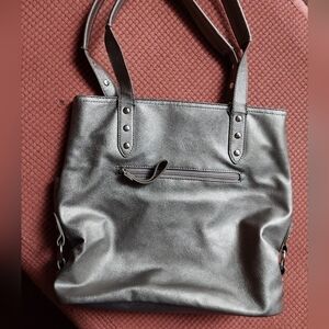 Relic Metallic Double-Front Pocket Tote Over-shoulder Bag. Zippered back pocket. Snap top closure. 3 section interior with zippered center. Dual straps are reinforced, giving extra stability. Pre-owned. Minor wear as shown in photos. Approx 13" x 14" x 3.5". Straps are approx 9" from center to bag top.