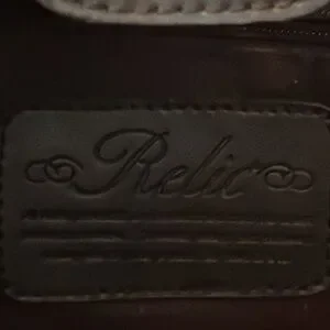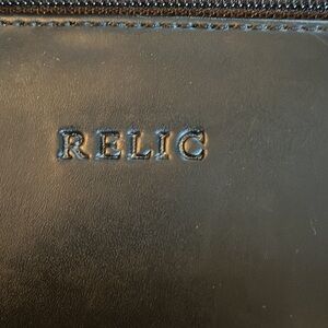 Relic purse. Black with flower embroidery on the front. Zippered interior section, plus a zippered pocket and 1 open pocket. Snap closure to the inside. Missing the long strap (there are loops to attach it on the inside). Zippered pocket on the back.