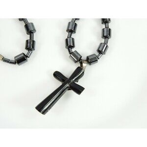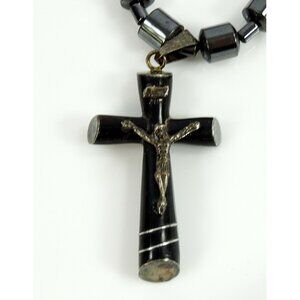 Religious Necklace Hematite Gray Beads Black Crucifix Cross Christian Catholic