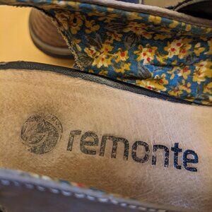 Very good used condition. Grey leather slingbacks with decorative blue leather strap over instep. The blue strap has a piece of elastic so it will fit with ease. Interesting blue leather part on stacked heel.