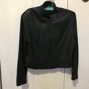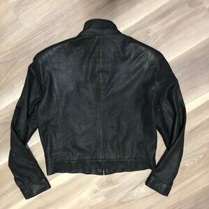 Soft buttery leather jacket with a front zipper closure. The collar is a mandarin style with a press stud fastener. The length of the jacket is 20". Sleeve length 24". Excellent condition vintage item.