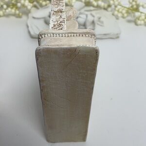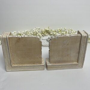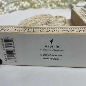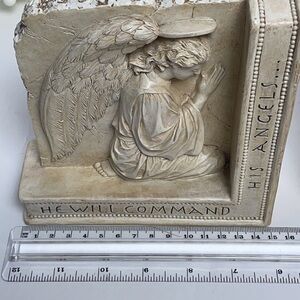 Bookend that states: He will command His Angels.. has no chips or cracks. Other bookend does have some damage that blends into the style of the bookend - I have taken pictures of the damage. Chips on top back and top left of one book of end.