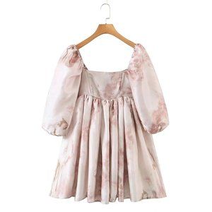Unbranded puff sleeve satin babydoll minidress with Renaissance art print. Has 1 outer layer, 1 petticoat layer for volume, and 1 soft inner lining in the skirt. (Has 3 different skirt layers for volume.) Invisible zipper at the back center and elastic sleeves.