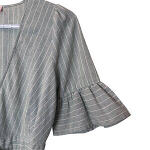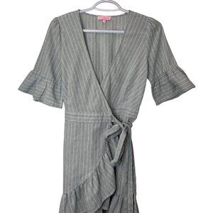 The dress features thin, vertical stripes and a wrap style front where one side crosses over the other and is secured at the waist with a self-fabric tie, creating a V-shaped neckline. It has short, flounce-style sleeves trimmed with ruffles and a ruffle detail along the hemline. The waist is cinched with the tie for an adjustable fit, and the dress has a mini-length hem that falls above the knee.