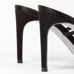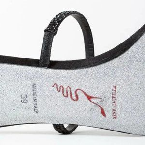 Made in Italy, the Bessie sandals from Rene Caovilla feature a chic minimalistic silhouette with a satin upper in black, jet black strass embellishments on the straps, a rounded toe, a stiletto heel, and a silver glitter outsole.