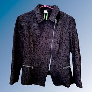 Stylish black blazer with unique texture. Features asymmetrical zipper and front pockets. Ideal for a modern look.