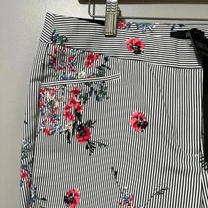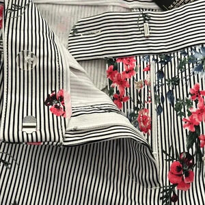 New! Zip up with hook closure. Front functional pockets. Black & white pinstripes with floral pattern.