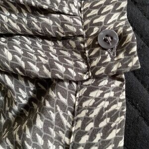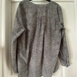 Renuar women’s very lightweight, gray, and white pull on top. V-neck. One button long sleeve. 100% polyester. Loose fitting.