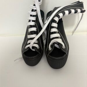Bold black boots with white laces. Chunky platform heel. Perfect for a standout look.