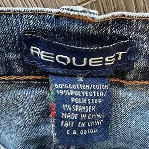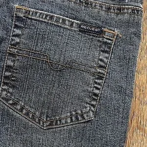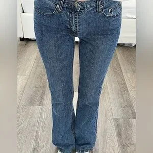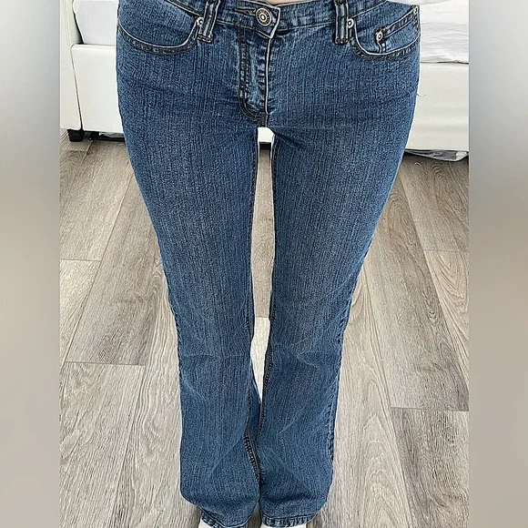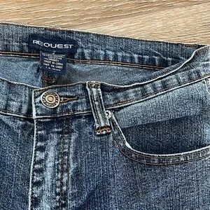 Good condition, has some wear. Thin lightweight denim, has some stretch. Hit at mid waist. Semi flare.