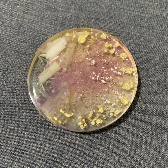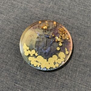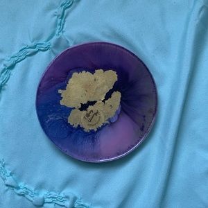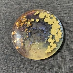 Two pieces 3.9” handmade circle shaped resin art designed for use as a decorative plate or drink coaster. Imbedded with paint, gold leaf and crystals.