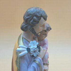 A statue of Saint Joseph holding the infant Jesus made of resin. Joseph wears a purple robe (perhaps to signify the status of being of Jesus' family) with an orange cloak while Jesus is wearing a pink robe. All of Joseph's clothes are hemmed in gold. I got 4 of these, still unused in their boxes, off of Creations Bella (who provide statuary to St. Joseph's Oratory in Montreal) as they had been sitting in their storeroom for years after they discontinued this particular statue.