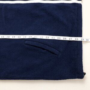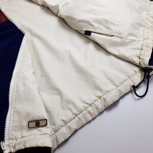 A versatile jacket in blue with red colour block and a creamy ivory colour on the reverse side. Made with nylon material on one side and cozy fleece material on the other side. It has side pockets on the inside and outside. The sleeves have elastic cuffs and the hem has a drawstring closure for easy adjustments. Perfect for spring and fall. Note*: A few imperfections as shown on last photo - a small crimp on the drawstring; on the cream-coloured side - a scuff on the arm, and small smudges in a few areas. However, it's still very cozy and will keep you warm and dry. Overall, it is in very good condition.