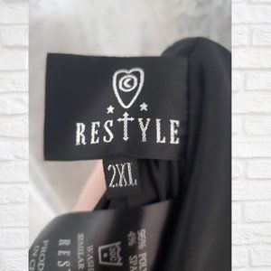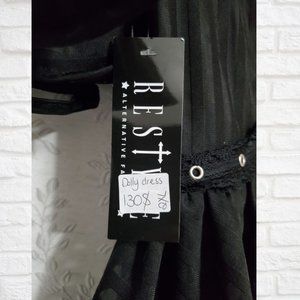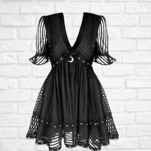 BRAND NEW never worn gothic dress with lace and puff sleeves. Fitted at the top and flared at the bottom, with a deep V-neckline. Crescent pendant charm, velour bow, guipure trim, and o-rings. Dress made of black fabric with a striped, translucent mesh overlay. 100% polyester.