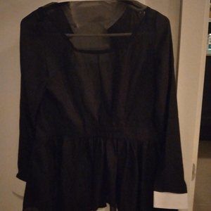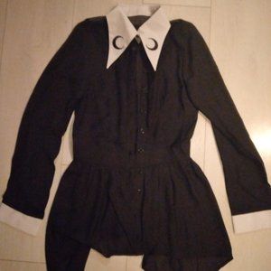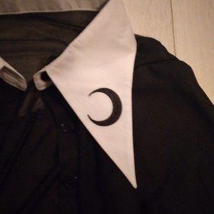 An elegant goth shirt for women, black buttoned front and large white collars with occult moon crescent embroidery. Made by Restyle.