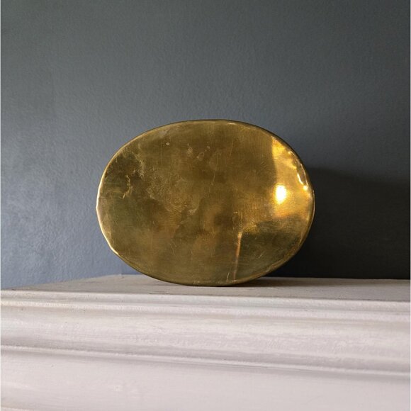 A pretty reticulated brass box with a lid. Likely imported from India in the 80s or 90s. An elegant storage solution for a vanity or desk. It would also make a lovely potpourri pot!