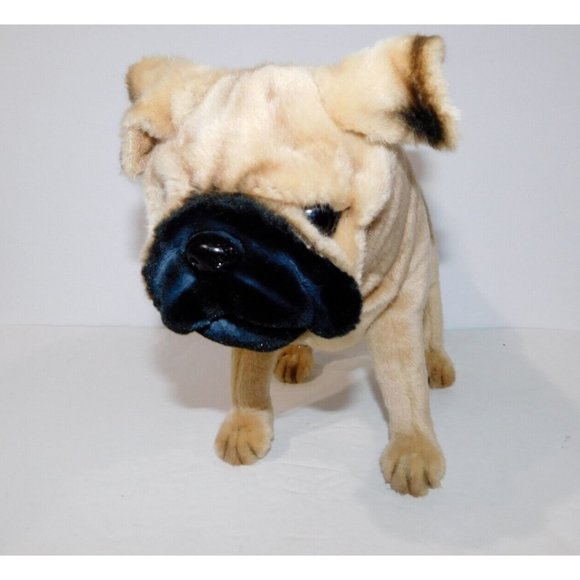 This Hard to Find 2010 Retired Hansa 15" Plush Standing Stuffed PUG Puppy Dog 5951 is in Excellent clean displayed only condition - tush tag still attached at rear . Features wire in legs to pose him in different way. Measures 15" from rose to rump not including tail and 10" from top of head to feet.