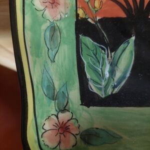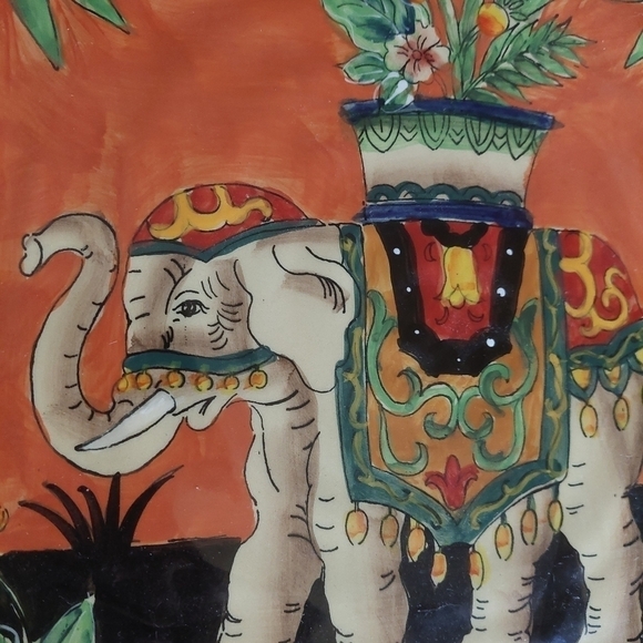 Retired in 2012, this is a lovely colourful plate displaying an elephant carrying a flower pot. Sides of plate is green with floral overlay. Rich greens, oranfe, tan and black. Approx 11.5" square. Use a wall decor, serving plate or trinket dish. Either way, guests are sure to comment on it. New West Indies.