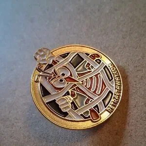 Unique enamel pin featuring a cartoon character. Vibrant red and white colors with gold accents.