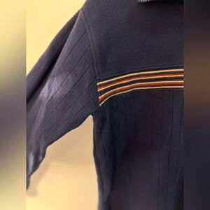 Stay warm and stylish with this Navy Sweater. Featuring a classic striped detail, this sweater is perfect for any casual outing.