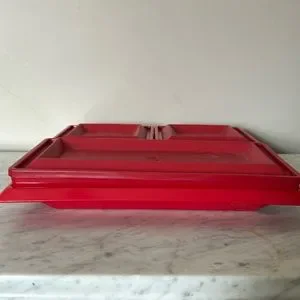 Unique 7 piece 1990s Tupperware serving set. 13 7/8 in square. Two smaller covered containers are 6 1/2 in square and larger container is 13 in w x 6 1/2 in.