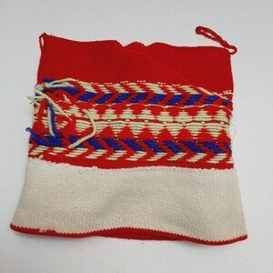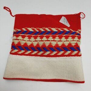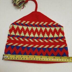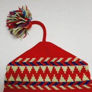 • Knit cozy beanie hat in red, blue and greenish yellow geometric multi-color intarsia pattern.