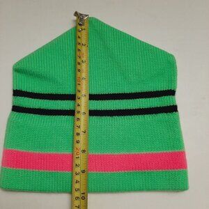 • Knit cozy beanie hat in green with pink and black stripe intarsia pattern.