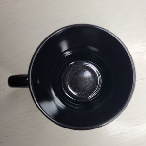Stunning 1980's/90s French mug with handle, black glass with abstract design. Design is a mix of green, gold, mauve, and purple and has a subtle metallic finish