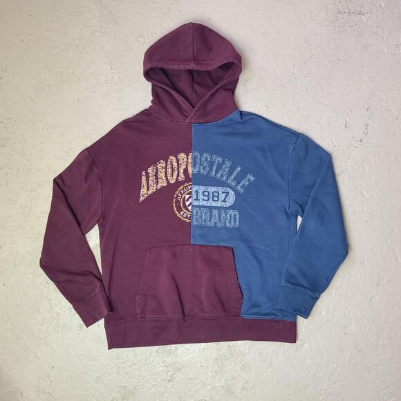 Retro 'Aeropostale' burgundy/navy split logo hoodie pullover sweatshirt men's XL