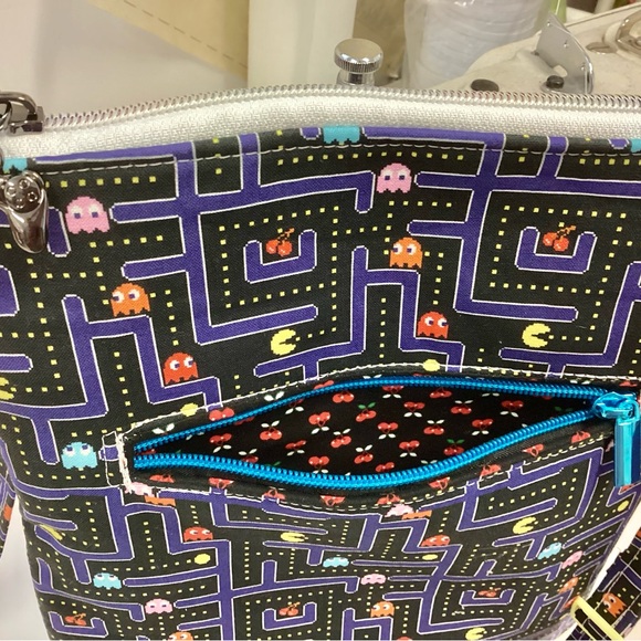 Stylish bag with a retro arcade game print. Features a vibrant design with colorful characters. Cute accent details and a cherry lining