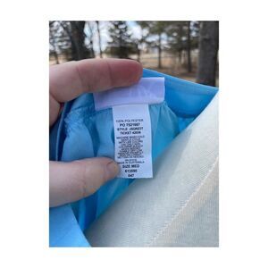 Size M on tags. 100% polyester. Unlined so fabric may be somewhat sheer. Stitched circle collar with button decorative detail in a 60s style. Short sleeves, smocked elastic waist/hemline. No stains, holes or tears. Pet and smoke-free studio.