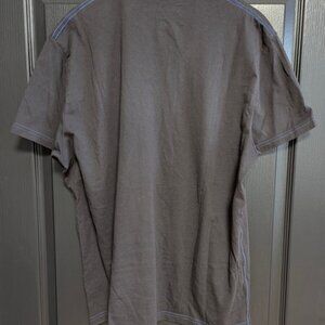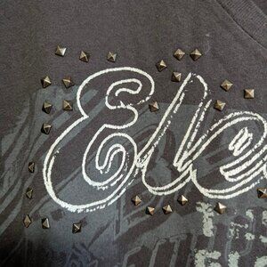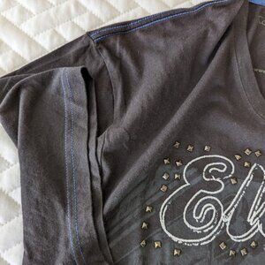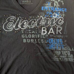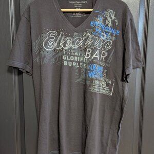 Calvin Klein V-Neck t-shirt in Men's XL in dark charcoal grey/black and light blue seams featuring an eclectic print and metal stud detailing.