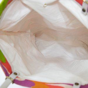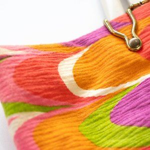 This is such a fun colourful pop of colour to brighten your outfit! Lined with vinyl, easy to clean. One small hole on interior vinyl, please see photos closely. In otherwise good vintage condition.
