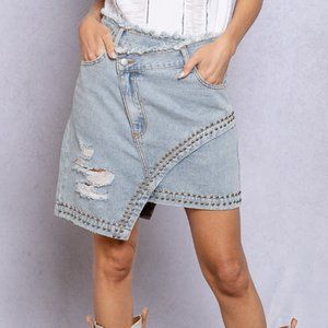 This skirt is if fabulous. 100% cotton denim with studs and distressing is perfect for the funky asymmetrical shape. The best thing is that this skirt also has belt loops.