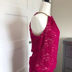"Retro Fuchsia Lace Evening Dress | Loose Overlapping Waist, Form-Fitting Skirt, Gold Chain Neck Detail