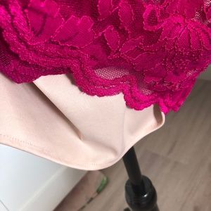 Step out in style with this stunning retro evening dress in vibrant fuchsia lace. The design features a loose, overlapping waist that beautifully contrasts with the form-fitting skirt, creating a flattering silhouette. The neck is secured with a chic gold-colored chain, adding a touch of elegance and sophistication.