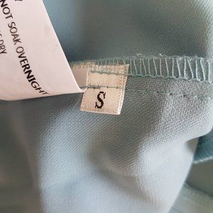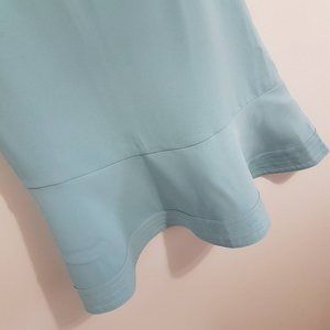 Stunning turquoise-grey retro dress with sheathed waist, shaped front and sleeve, and scooped neckline. Mid-weight fabric that works perfectly for both evening and day outfits. Back zipper and dress in excellent condition.