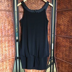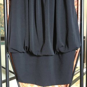 Excellent vintage condition, black jersey with satiny trim bubble dress by IZ Byer California. This flattering dress was made in the U.S.A. is modern, contemporary and simple. Great for clubbing and parties, but can be paired with flannel or layered for a less formal look. Would look great worn with long beaded costume jewelry necklaces or long gold snake chains. Perfect for Halloween or Rocky Horror Picture Show.