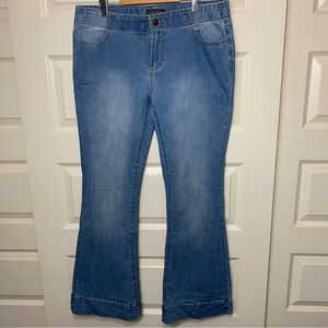 In great condition, comfy stretchy light wash jeans, flare leg, 4 pockets, nice large waist band, zipper and button closure, tiny wears on leg hems no holes. Please see pictures.