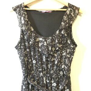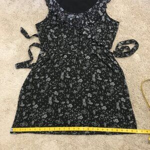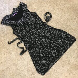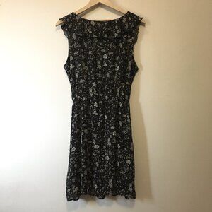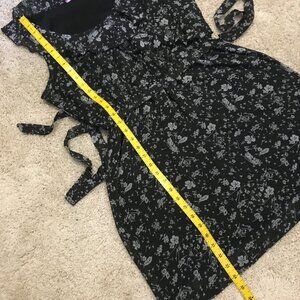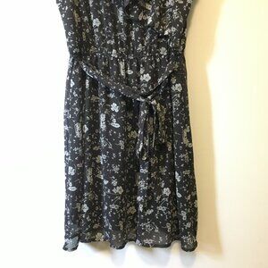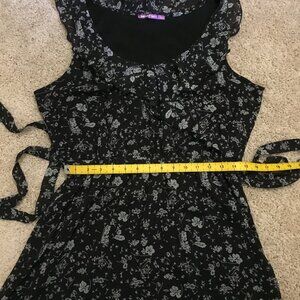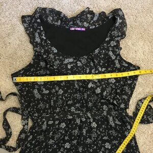 Very good preowned condition, black with a ditsy white floral pattern, ruffle collar, belted dress by Smart Set. I believe this is from Y2K. I could be mistaken though. Thin, chiffon, semi sheer fabric that is lightweight and perfect for summertime.