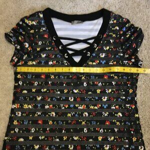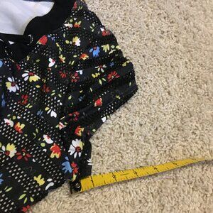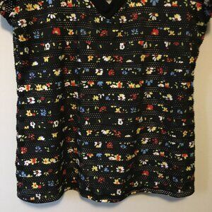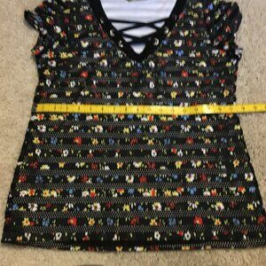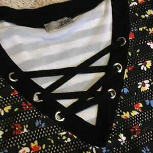 Very good preowned condition, cross lace up, short sleeve t-shirt by Zoe, featuring alternating bands of black mesh and floral textile in black, blue, white, yellow and red. Collar and lace up is solid black. This is a very unique and unusual shirt with lining and adventurous decisions. Super duper cute. I believe this is a Canadian brand (not zoe zarnista).