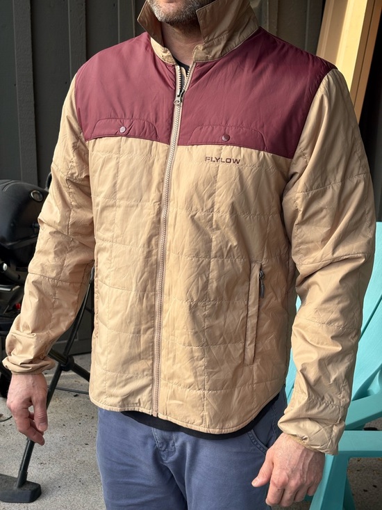What to say about this jacket! Retro aspen ski bum jacket. men's insulated jacket in beige with burgundy yoke. Lightweight warmth with full zip and stand collar. Two zippered hand pockets and secure snap chest details. Designed for everyday layering and outdoor comfort.