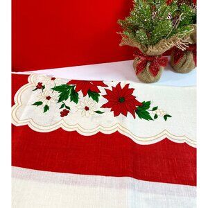 Vintage NOS Elite Creation ‘New Noel’ cotton/linen rectangular table cloth featuring a red poinsettias, white flowers and green foliage pattern with wide red trim around the edge, all on a slightly off white background.