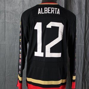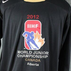 Up for sale is a retro hockey jersey. It has a black base colour with red and gold trim. The front of the jersey has the 2012 IIHF World Junior Hockey Championship logo stitched in. Each sleeve has a strip stitched on which has all the teams from the tournament on it. The back of the jersey has Alberta 12 crested on. What a great jersey do not miss out on it.